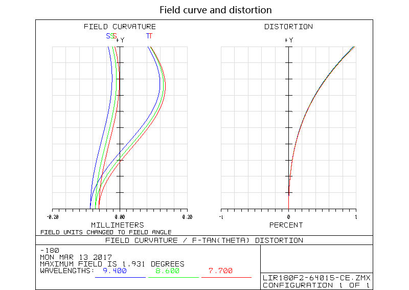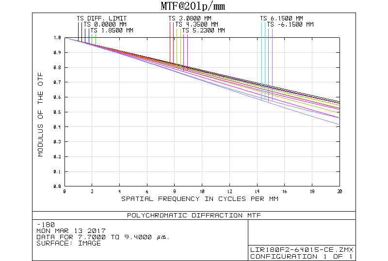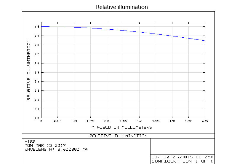 This lens module is of a built-in motorized mechanism, with a focal length of 180mm and an f-number 2.0, it is oriented for cooled detectors at the LWIR wavelength range of 7.7-9.4 micro. it is optimized with high transmission, superior MTF, and low distortion. The sealing grade of the housing is IP67, the weight about 1kg. Modification in specifications for this module is acceptable.