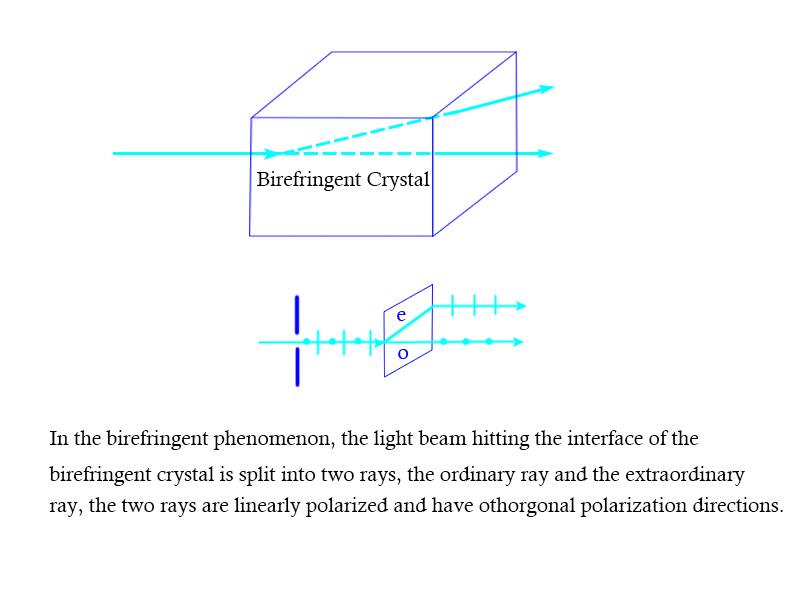 The anisotropy of these crystal materials results in the separation of one light beam into two light rays when hitting the interface. The two split light rays encounter different refractive indices: one called the Ordinary Ray, which is governed by the ordinary refractive index, and another called the Extraordinary ray, which is governed by the direction-sensitive extraordinary refractive index. The two rays always have their polarization direction perpendicular to each other.