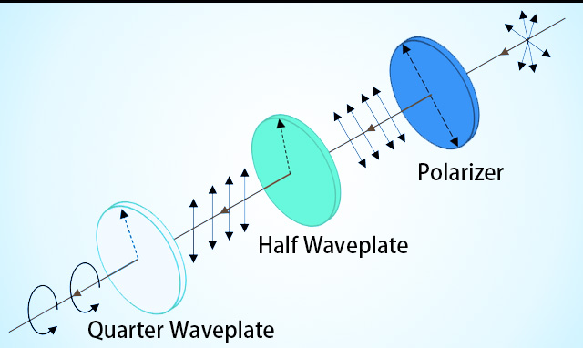 One may obtain a polarization state generator by combining a half waveplate and a quarter waveplate. The operating principle of this set of waveplates is that, when a linearly polarized light is projected to the surface of the half waveplate if the directions of the fast axes of the two waveplates align completely, the output light beam will remain linearly polarized, in this case, the half waveplate could be used to alter the direction of polarization of the light beam. If the directions of the fast axes of the quarter waveplate and the half waveplate do not match, then the output light will be either circularly or elliptically polarized, where the ellipticity and the direction of rotation(clockwise or anti-clockwise) could be modulated using the quarter waveplate.