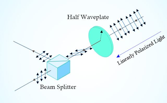 Firstly the incident light beam of linear polarization travel through the half waveplate, and its polarization direction is altered. The exiting light beam then passes the beam splitter, where it is divided into two orthogonal light beams. By rotating the half waveplate intensity modulation could be realized.