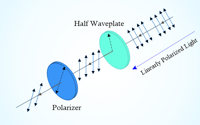 The half waveplate in the middle then rotates the polarization direction, after passing another polarizer, optical attenuation is realized. The actual ratio of optical attenuation depends on the angle between the polarization direction rotated by the half waveplate and the polarization direction of the polarizer. However, this type of optical attenuator is more feasible for linearly polarized systems and more difficult to realize in systems without a certain polarization state.