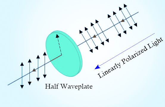 When linearly polarized light is projected normally to the plane of cut, with its polarization plane making an angle of α to the fast(or slow) axis of the half waveplate, the polarization plane of the incoming light will undergo an angle rotation of 2α when exiting. This key feature of half waveplates makes them multi-functional for various optical applications.