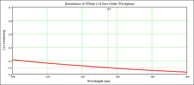 Figure 2. The graph above illustrates the change in retardation via a wavelength spectral for 355nm, Zero Order Quarter Waveplates of Quartz.